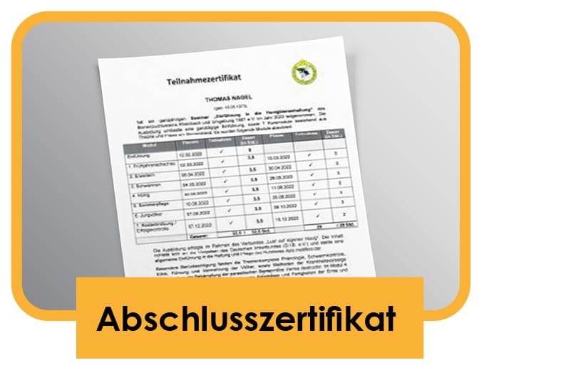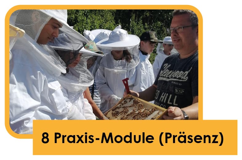 Die Ausbildung dauert ein Jahr. In dem Jahr nimmst du an 8 Theoriemodulen und 8 Praxistagen teil. Du lernst den Umgang mit den Bienen, alle erforderlichen Arbeiten und alles, was du wissen musst, um ein Volk zu führen und gesund zu halten.